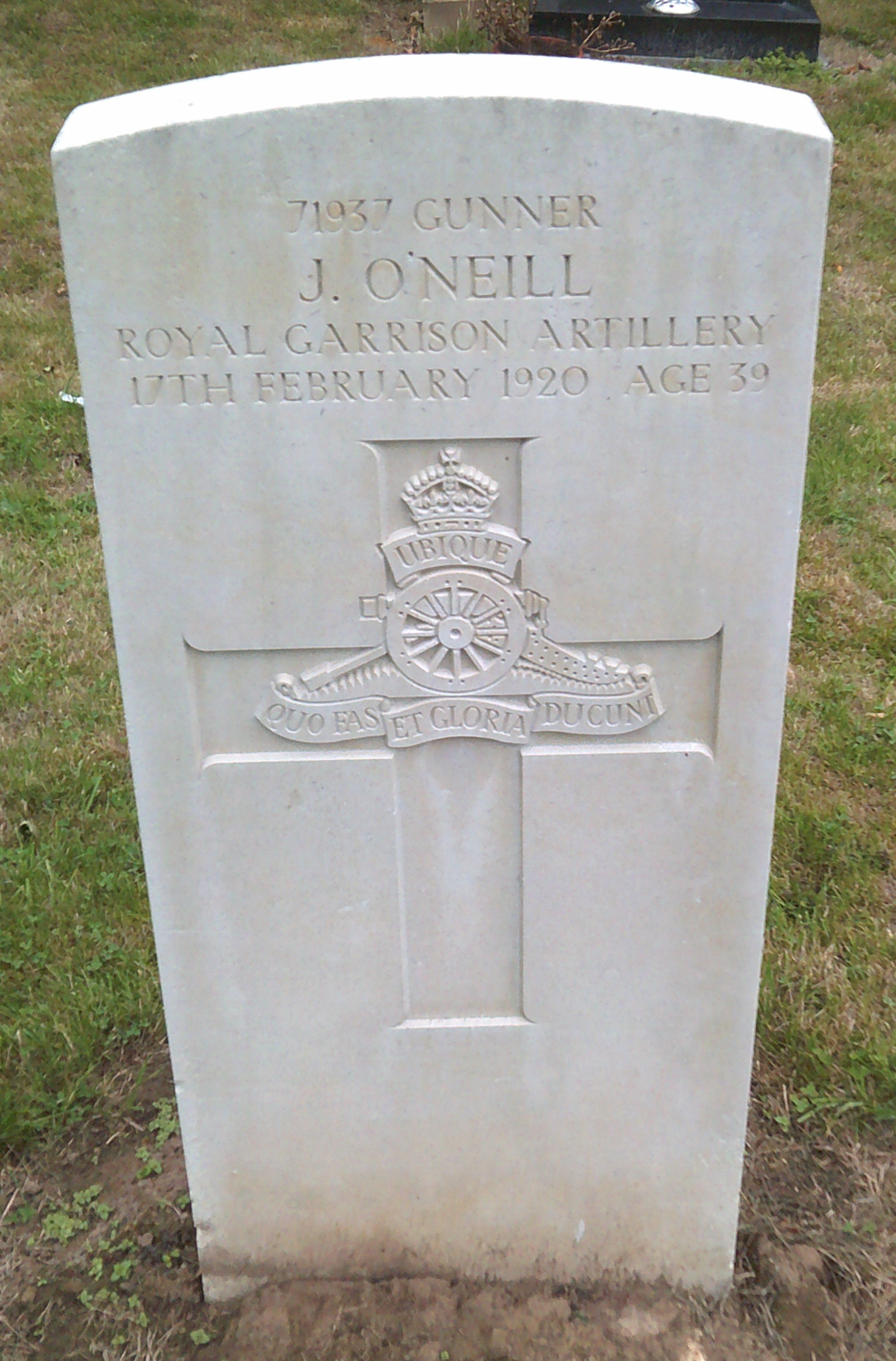 John's health never recovered and he died on 17 February 1920. He was aged 39 and unmarried. Gunner John O'Neill, 71937, 330th Siege Battery, Royal Garrison Artillery is buried in Grave J.14 at Poulton le Fylde Old Cemetery.